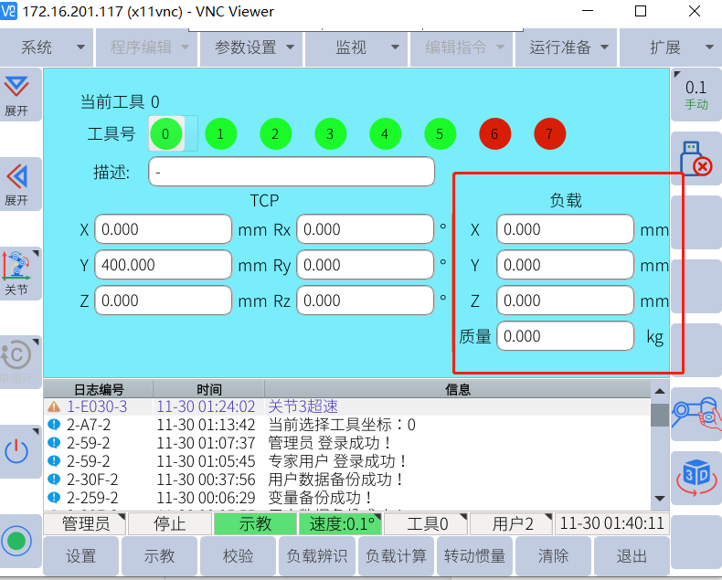 点击运行准备---工具负载设置,用户可以同时设置8个不同的工具使用(0-7)。