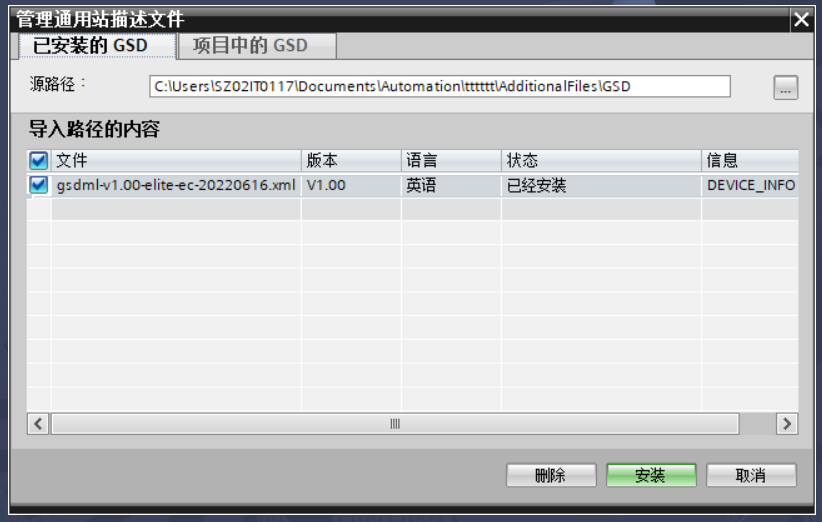1.   将下面链接的米兰·(milan)中国机器人GSD 文件安装到 TIA PORTAL 中管理通用描述文件,如图 2-2 所示。
