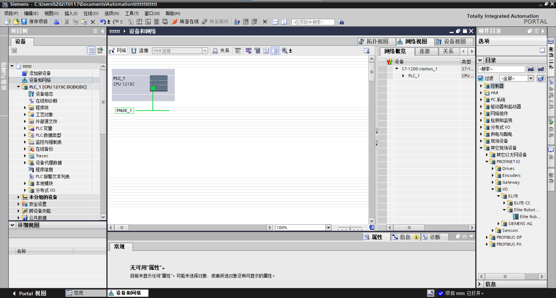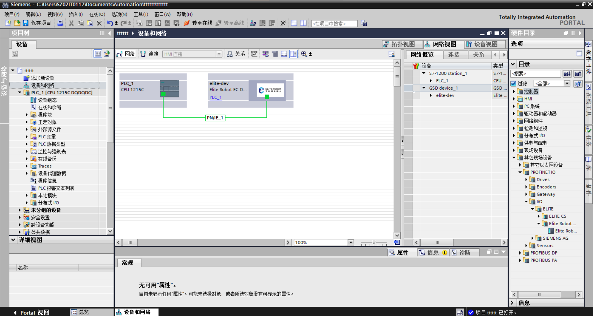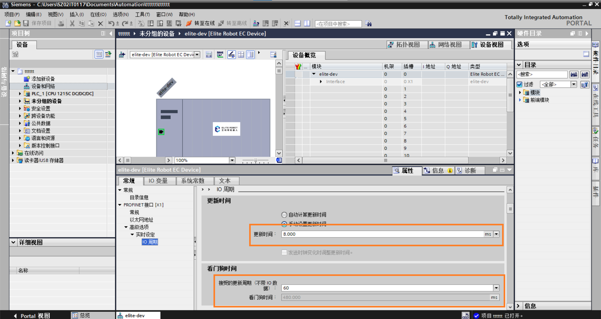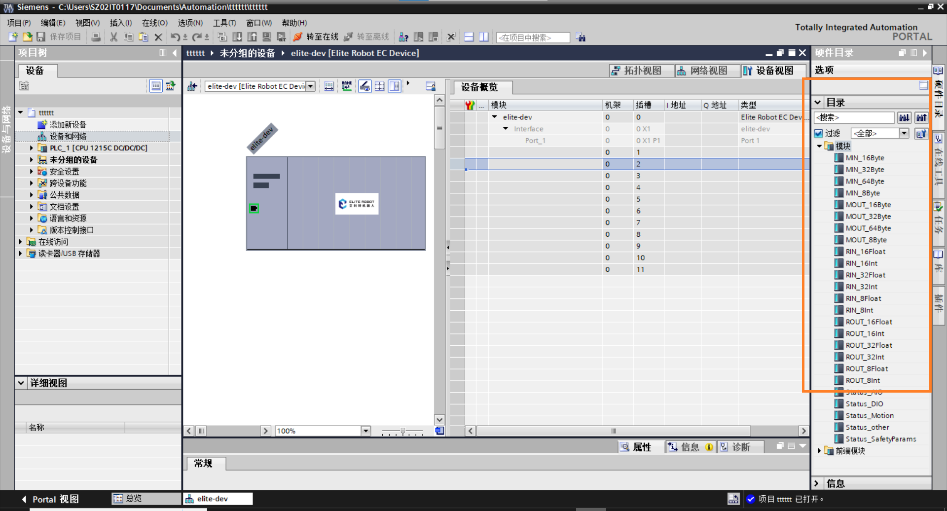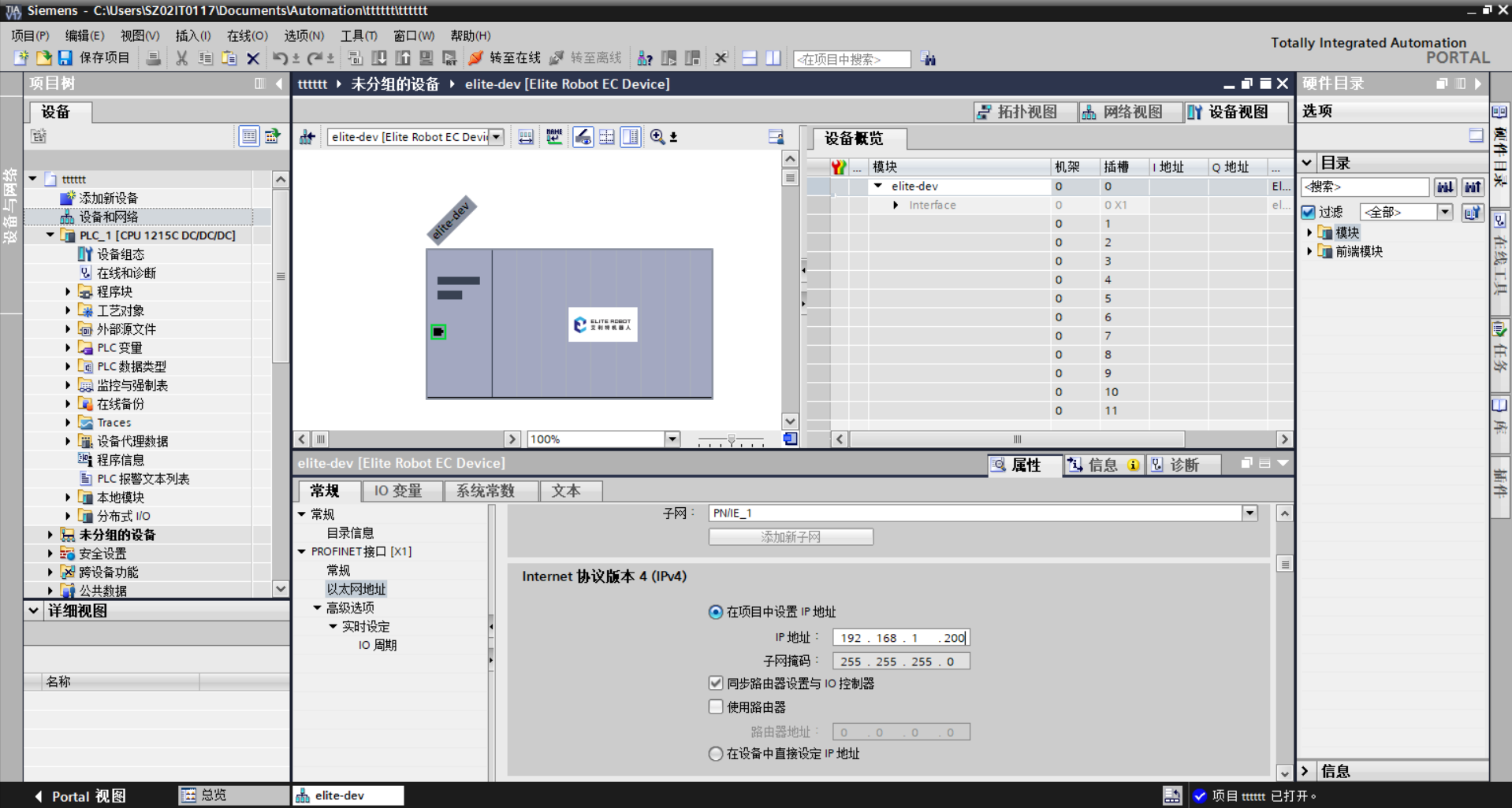 2.  添加 Elite Robot EC Device 到设备和网络,点击左侧设备和网络,进入页面,在右侧目录栏找到其他现场设备-profinetI/O-IO-elite,找到elite robot EC Device如图 3-3 所示。