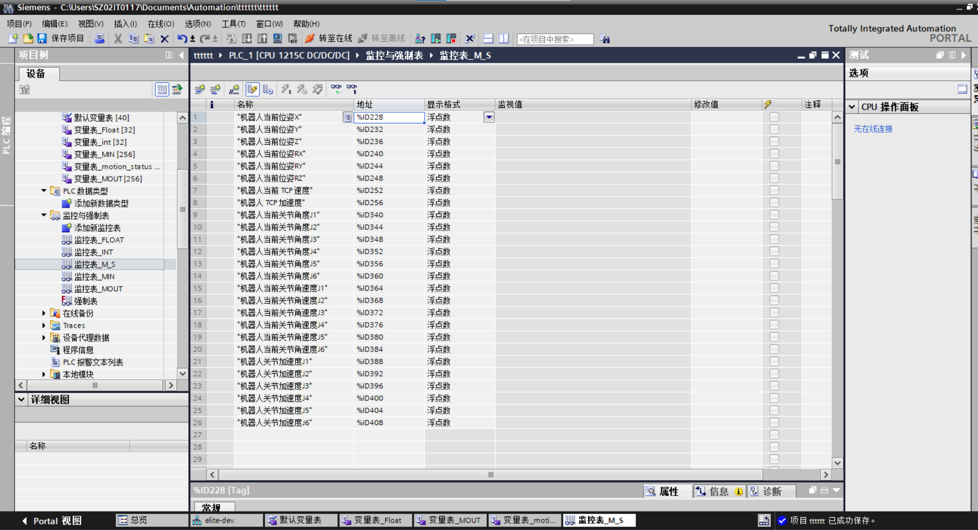 8.  添加完成之后,下入PLC,转至在线即可开始监视机器人状态与M变量。(32位以上要重启机器人,否则PLC会报错下位组件错误)。