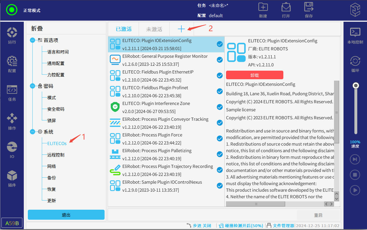 把插件放在U盘插入示教器U盘接口,点击右上角ELITE图标,再点击设置(需要的相应插件请联系ELITE技术人员)