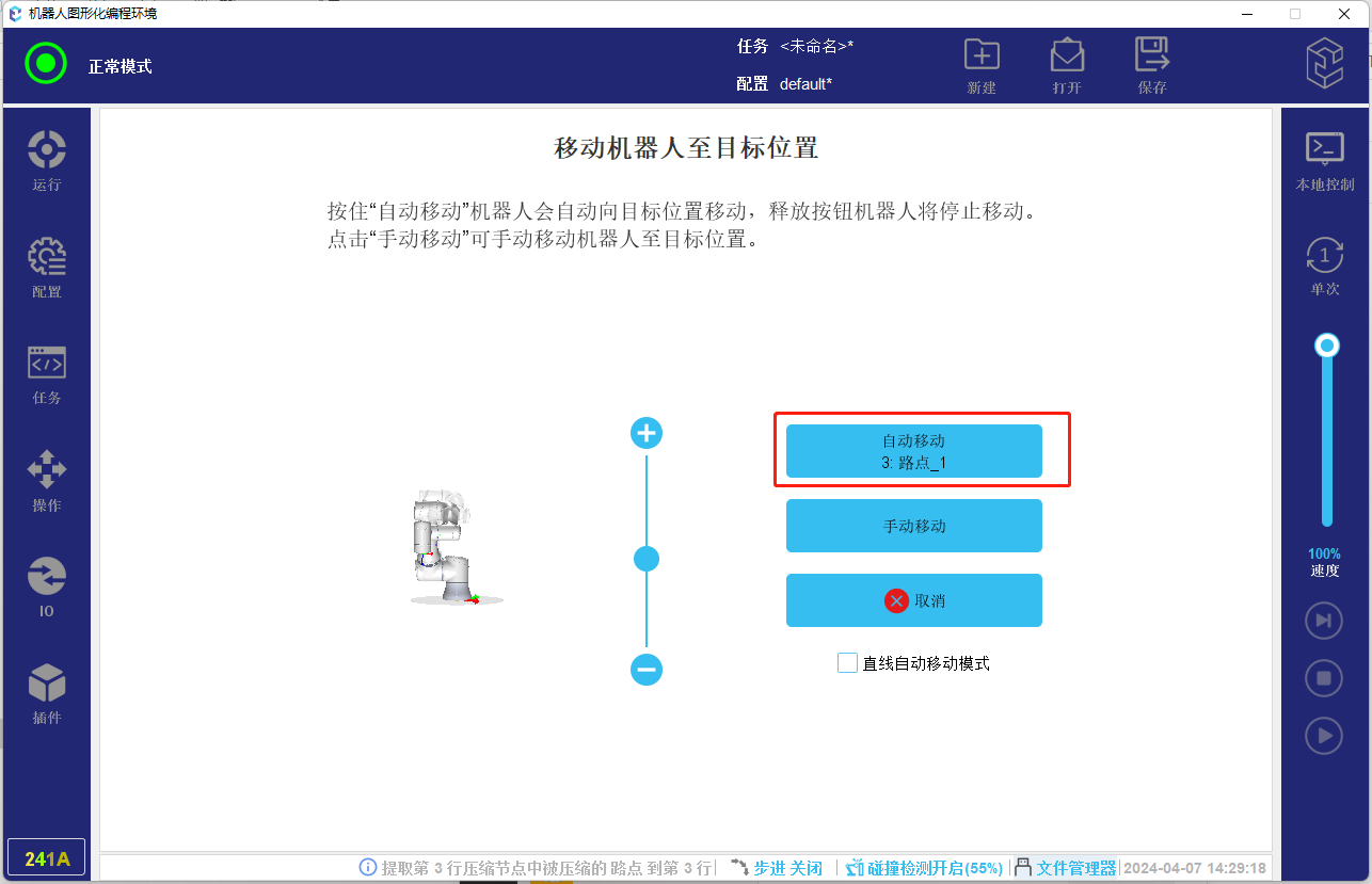 ● 固定位置路点与原点任务节点:程序运行时如果机器人不在该路点或原点位置,则会弹出手动运行到位置的页面,让用户手动控制机器人,移动到起始位置。如图-1所示