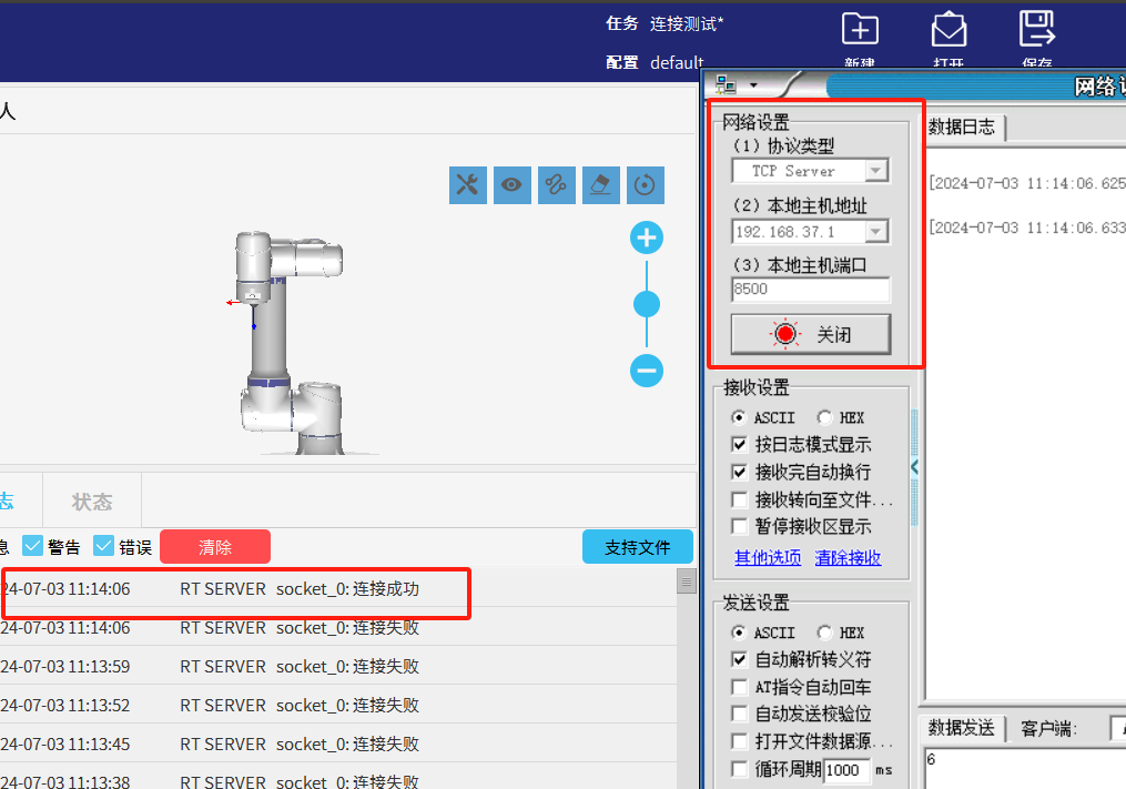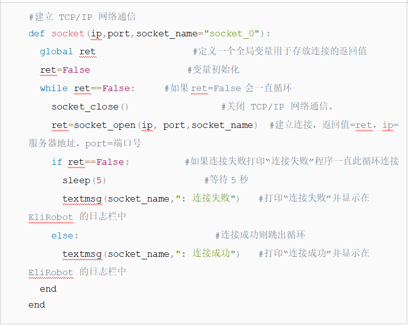 2.为了避免图1-1的情况发生我们可以利用socket_open()建立 TCP/IP 网络通信时的返回值做条件判断循环连接直到连接成功后程序才继续往下运行。如图1-2所示如果服务器未打开时机器人会一直与服务器建立连接并打印“连接失败”到EliRobot 的日志栏中。