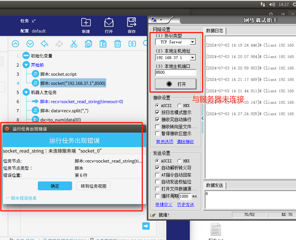 1.当我们单纯使用 socket_open()建立 TCP/IP 网络通信指令时,如果服务器还未打开时,机器人端户端未连接到服务器,程序依然往下运行,运行到发送/接收时机器人就会报错如图1-1所示,这样机器人就必须初始化重新运行。