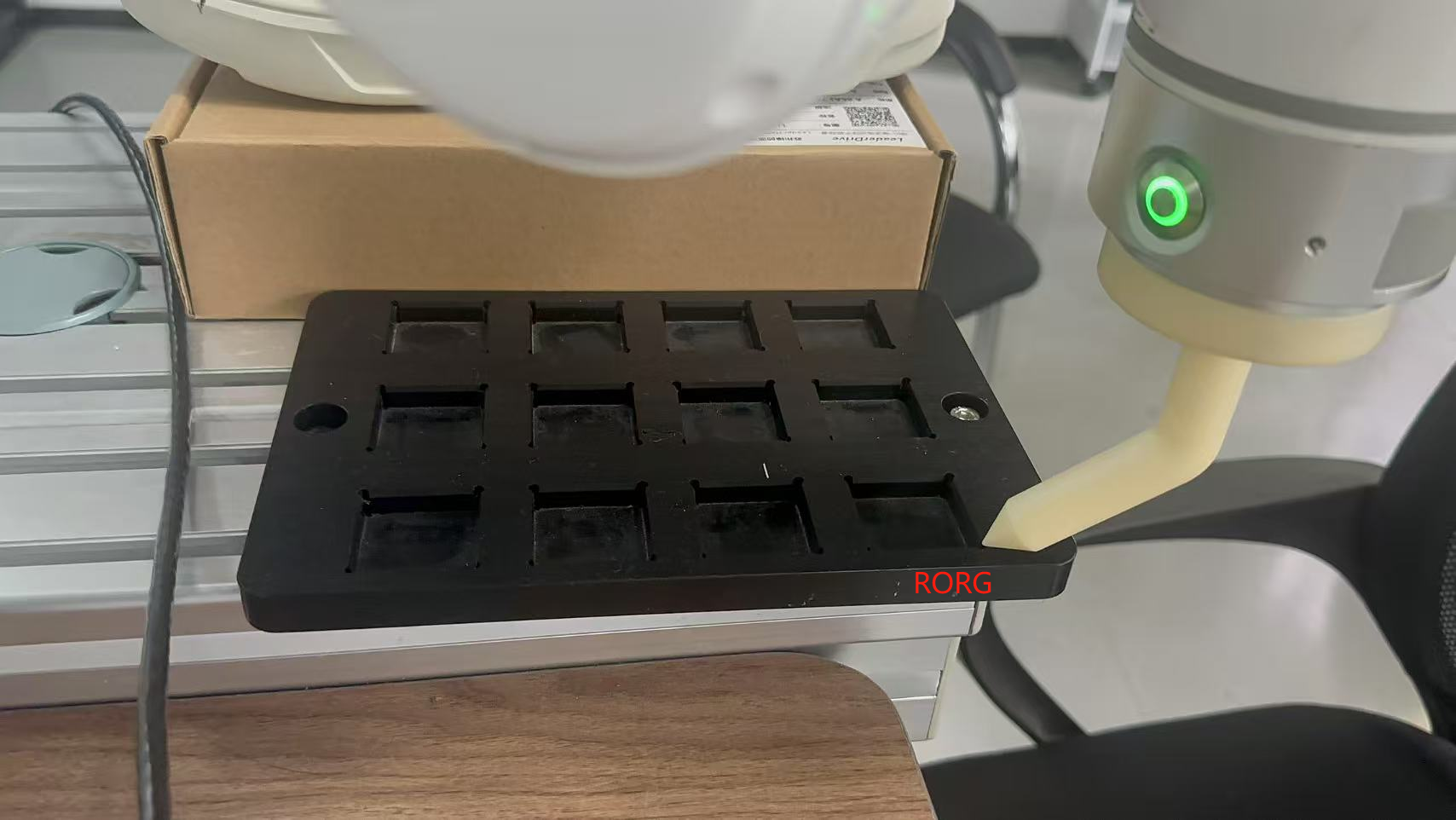2. 2 选择8号坐标系>>示教三个点,RORG对应X和Y方向原点,RXX对应X+方向,RXY对应Y+方向,非正交的RXY需要基于原点精准示教出来,Z+方向是计算出来。注意:X+和Y+方向不能在同一直线内。建议机器人末端安装尖点,坐标系精度更高,如下图中三个点示教位置: