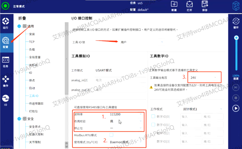 3.  安装好后设置工具IO的参数,工具输出电压,波特率,奇偶校验,以及使用模式,不同品牌的力控传感器参数设置不同,这个需要注意。如下图: