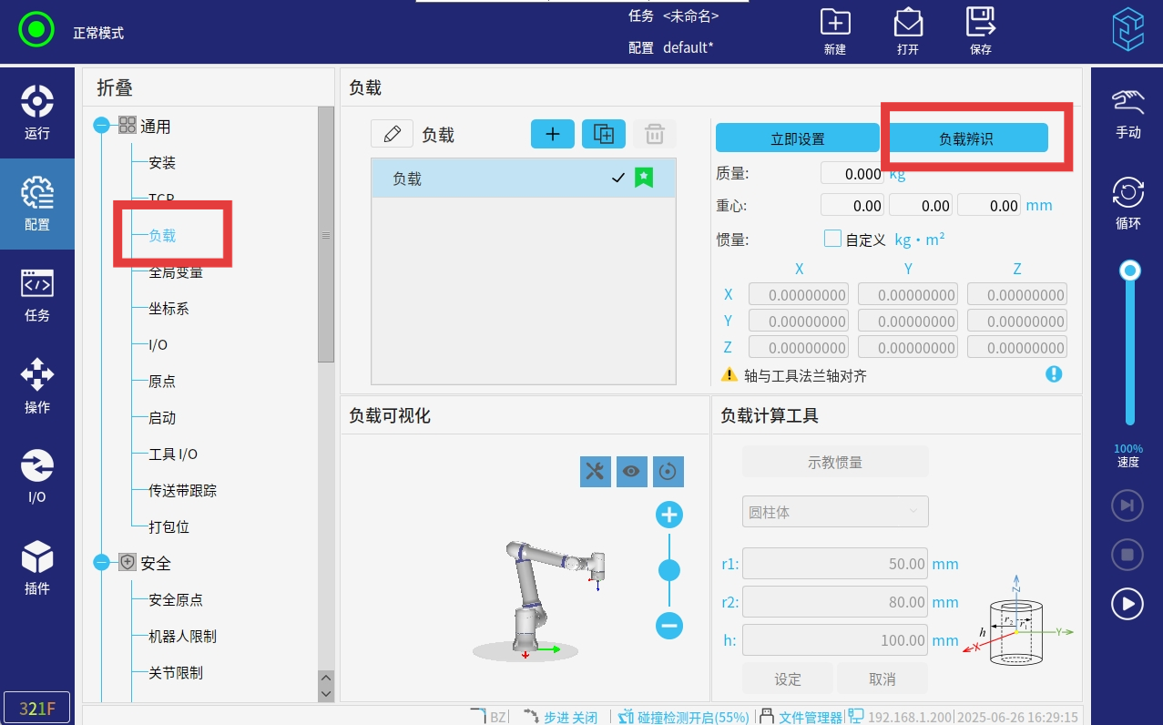 打开力控插件后,需检查一下负载补偿与原始数据,是否正常,如果不正常,需要做力传感器标定。也可以稍微给力传感器外部施加力,检查负载补偿是否有数据,如果没有数据,也是说明不正常。