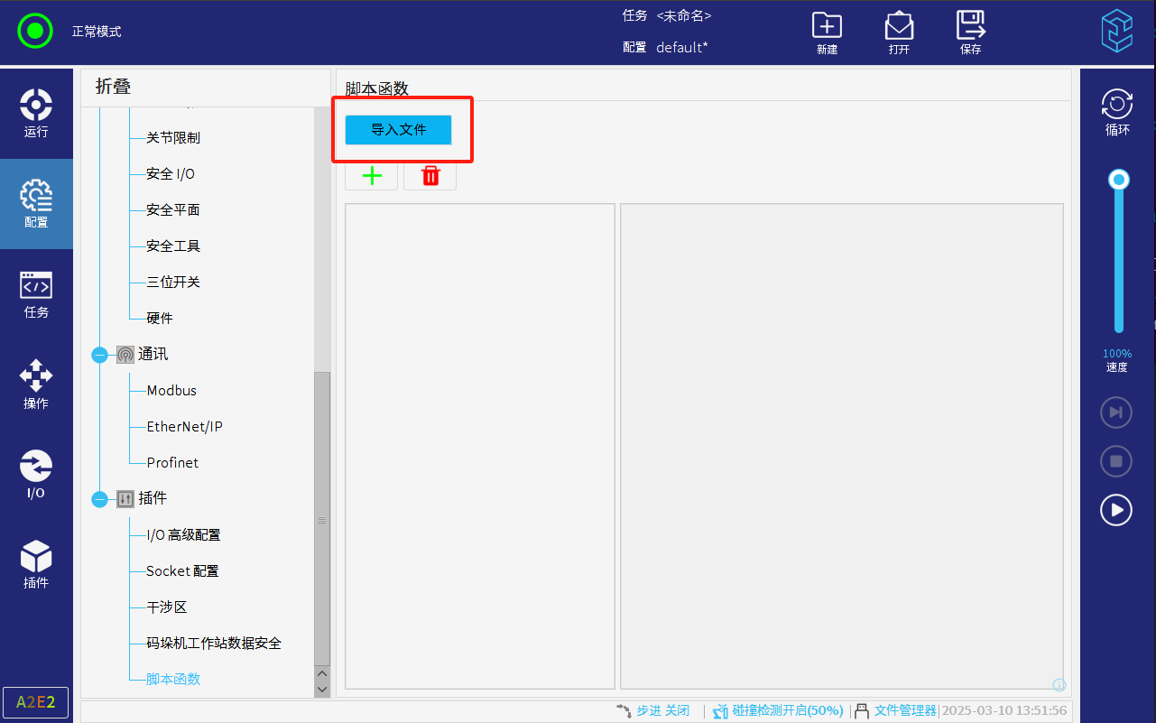 点击配置 >> 插件 >>脚本函数,点击导入在外部写好的文件,选择.script后缀的文件,插件可 以自动加载文件并解析文件中的函数。