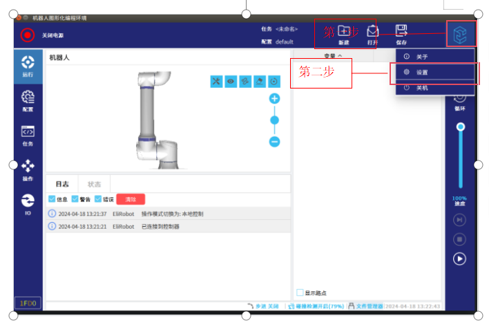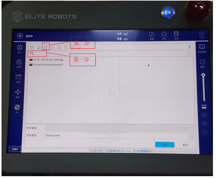 2.2.1:将带有机器人备份文件的U盘插入示教器或控制柜的USB接口,机器人备份文件后缀为.zip,按照图-7操作步骤所示,右上角点击进入到机器人设置界面。