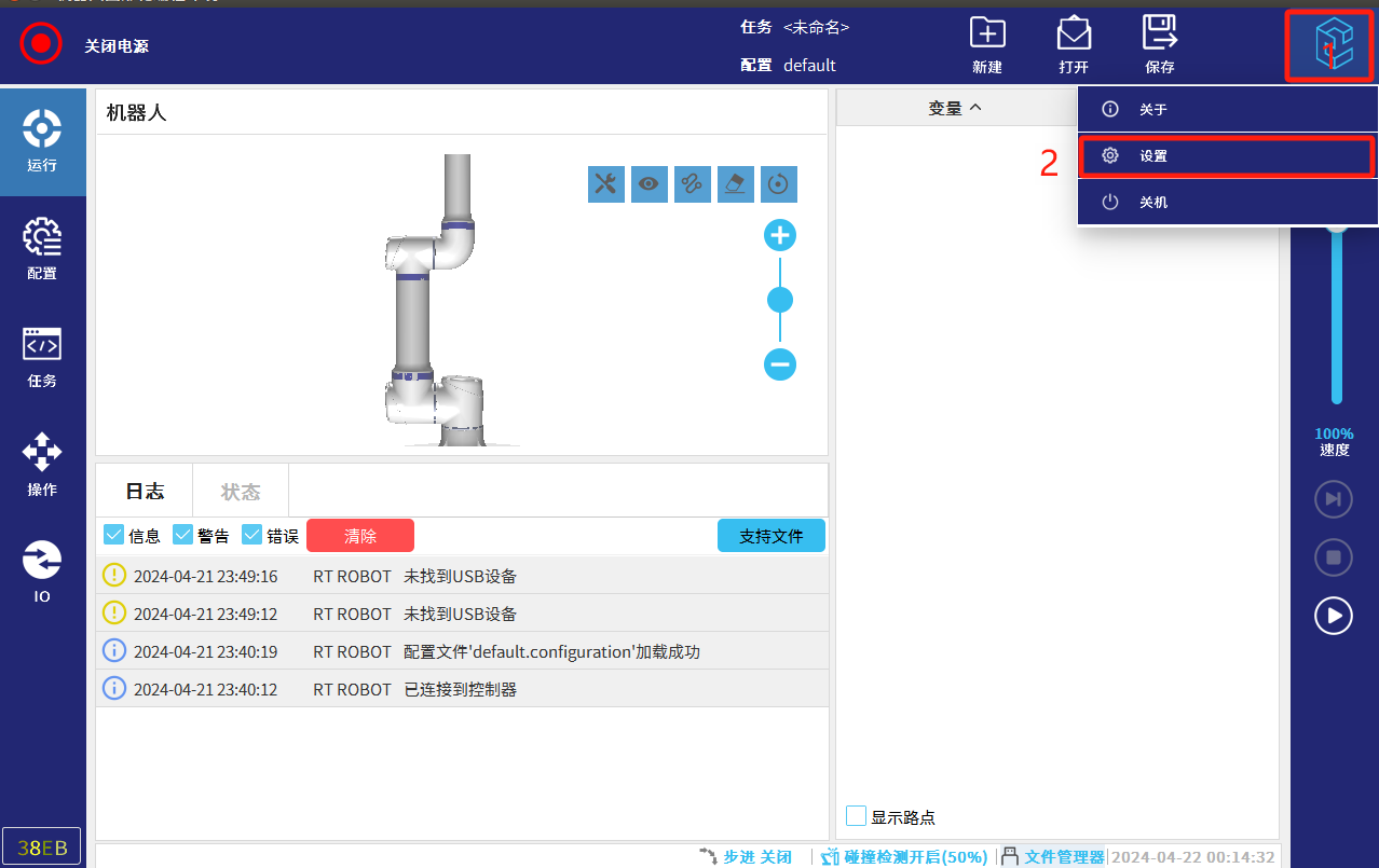2.1.1:将U盘插入示教器或者控制柜的USB接口,点击界面右上角米兰·(milan)中国图标→设置,然后如图-1所示