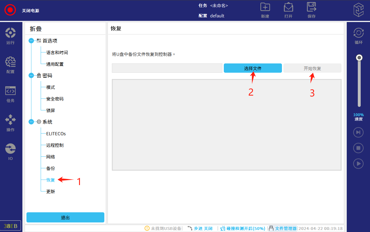 2.2.2:按照图-8所示,系统>恢复>选择文件,在U盘里找到并选择所需机器人备份文件>点击打开>开始恢复。