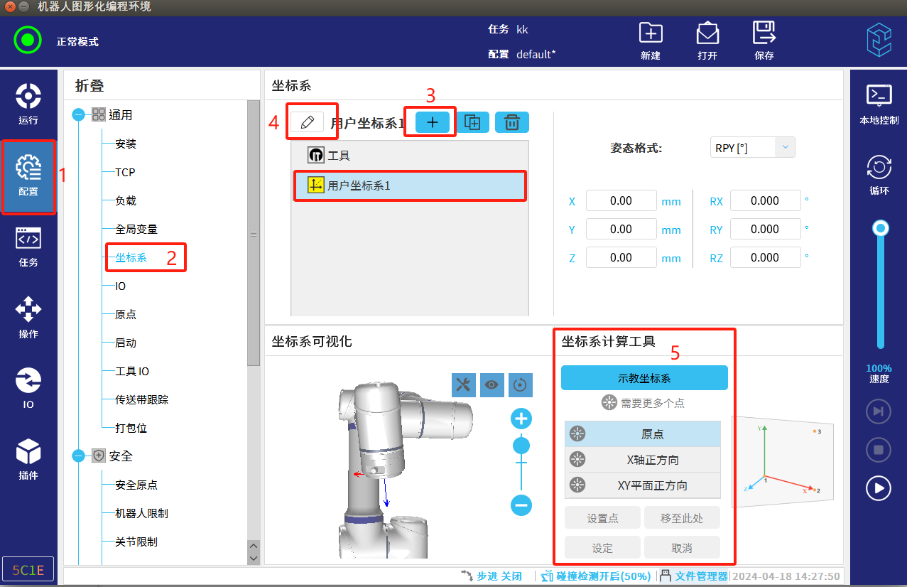 根据作业空间的平面来示教三点建立用户坐标系。先示教原点,再示教X,Y,的正方向自。在三维坐标系中,如果已知 X 和 Y 轴的方向,可以使用右手定则确定 Z 轴的正方向。